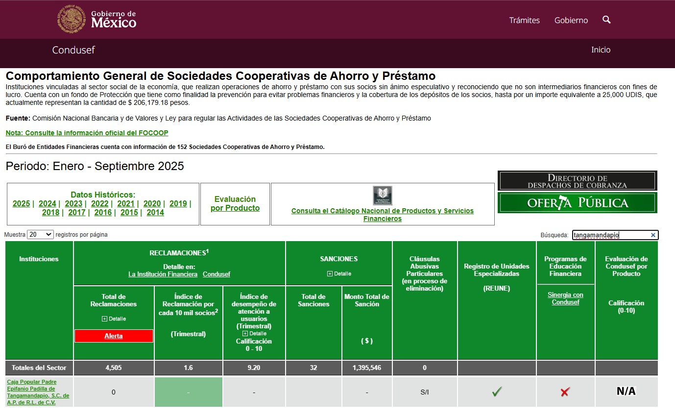 Podrás consultar la información que consta de Caja Popular Padre Epifanio Padilla de Tangamandapio S.C. de A.P. de R.L. de C.V, en el Buró de Entidades Financieras a través del siguiente link: "http://www.buro.gob.mx/BuroSector.php?Sector=29"